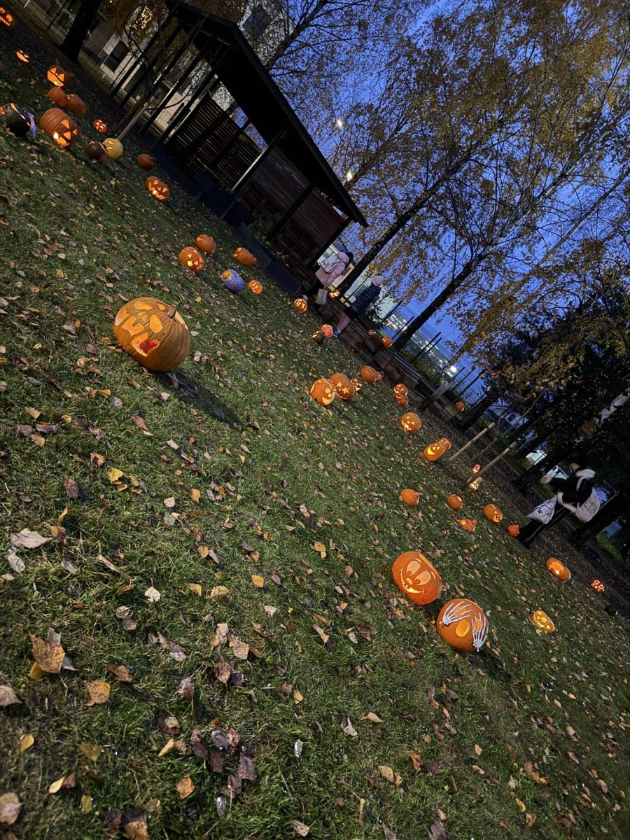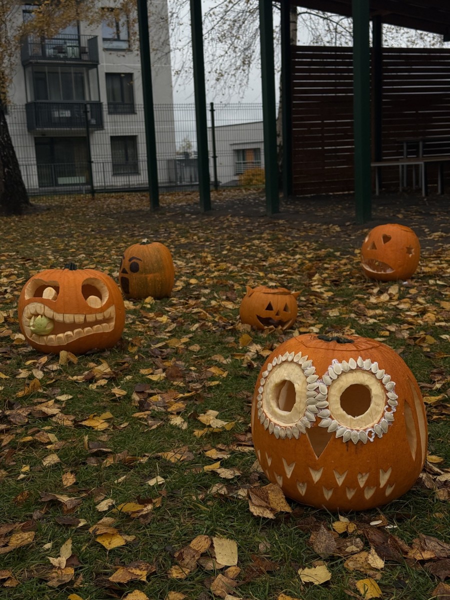 Mokyklos kiemas šią savaitę suspindo šimtais švieselių, šypsenų  ir išradingai išskaptuotų moliūgų