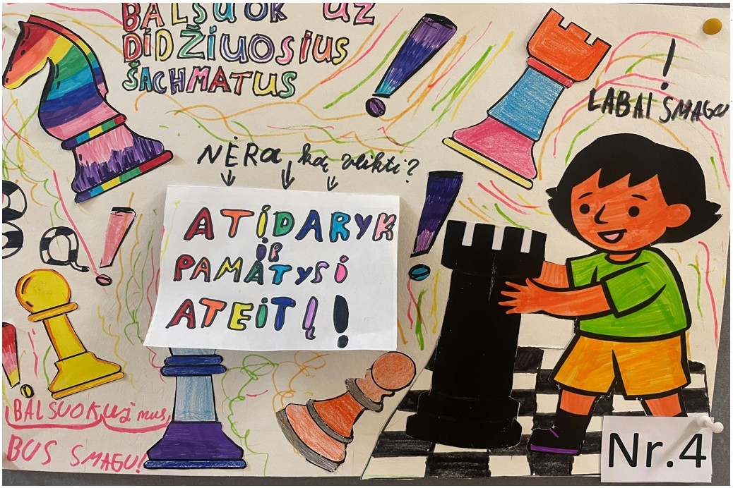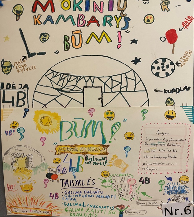 Kad jų sumanymai pasiektų kuo daugiau mokinių, vaikai kūrė reklaminius plakatus, pristatinėjo savo mintis ir kvietė visus balsuoti už labiausiai patikusią idėją. Kūrybiškumo ir entuziazmo tikrai netrūko!