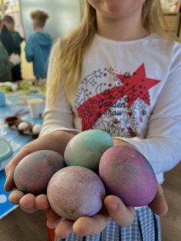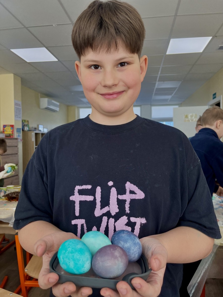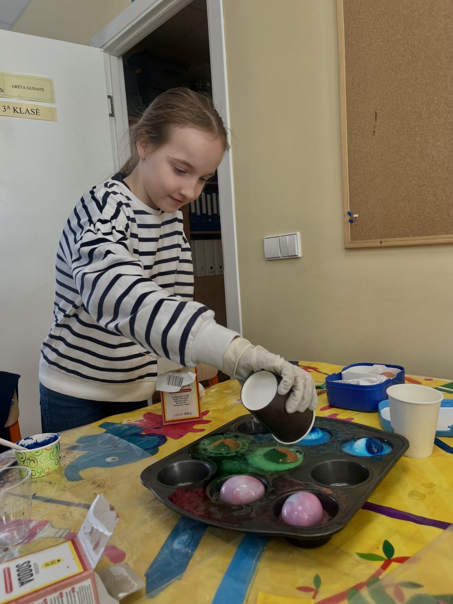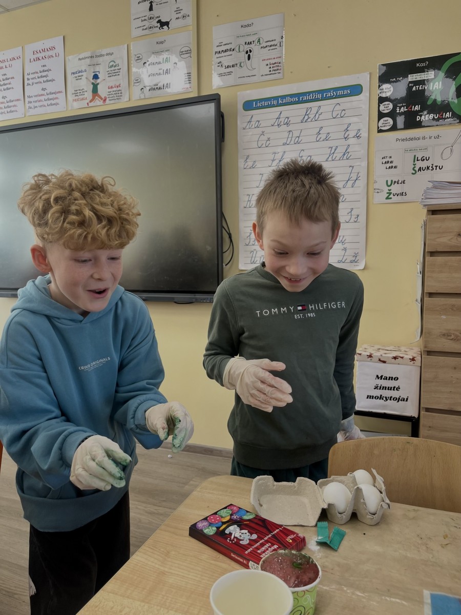 Mokiniai kiaušinius dažė kiek netradiciškai – naudojo sodą, actą ir maistinius dažus.