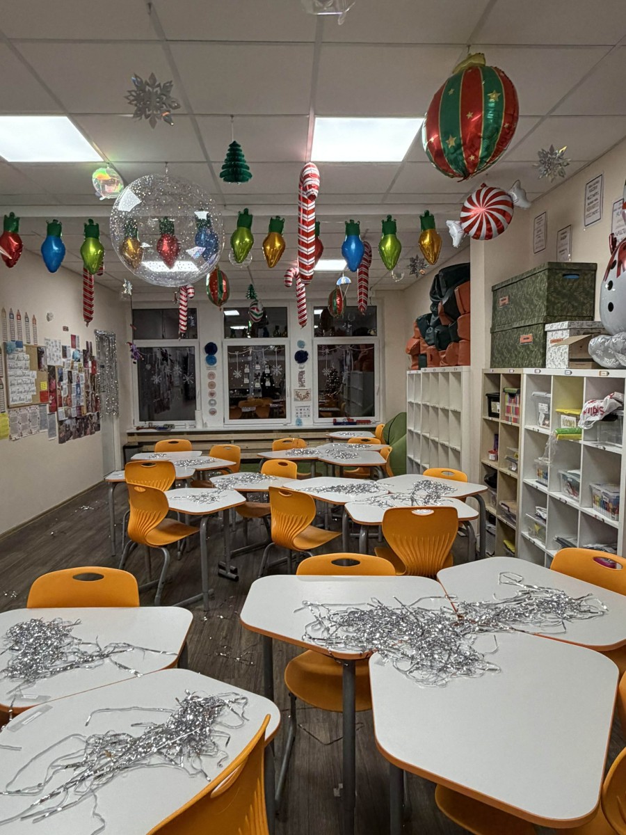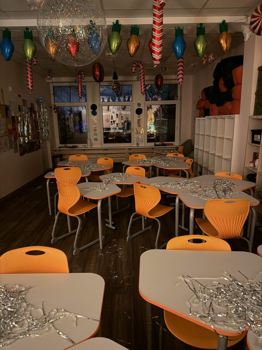 Klasėje priberta tiek blizgučių, kad viskas tiesiog tviska ir blizga – tikras elfų šou! ✨🎆